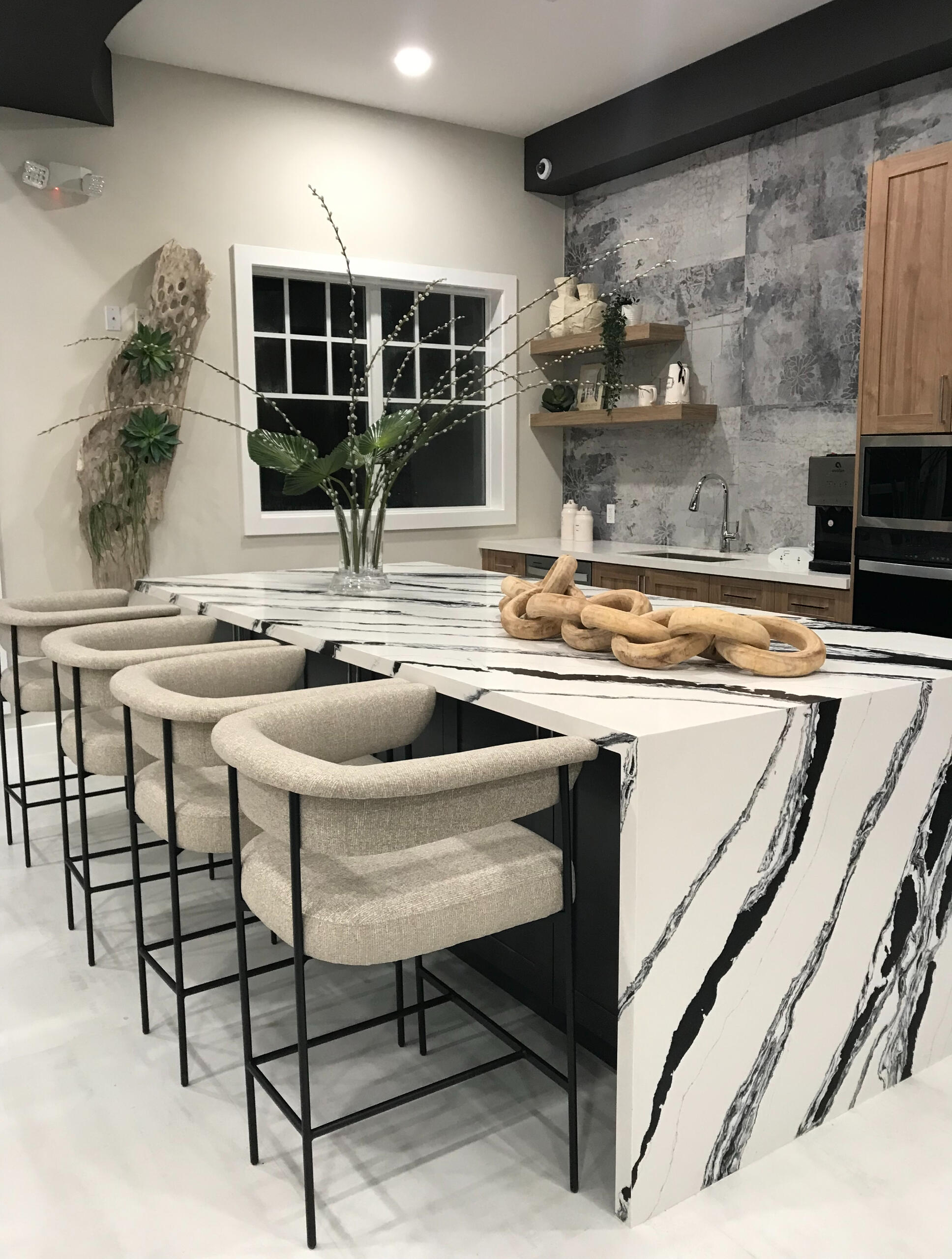 Una cocina abierta que destaca por su isla de mármol con detalles únicos y acabados en tonos naturales, logrando un balance entre funcionalidad y estilo.
